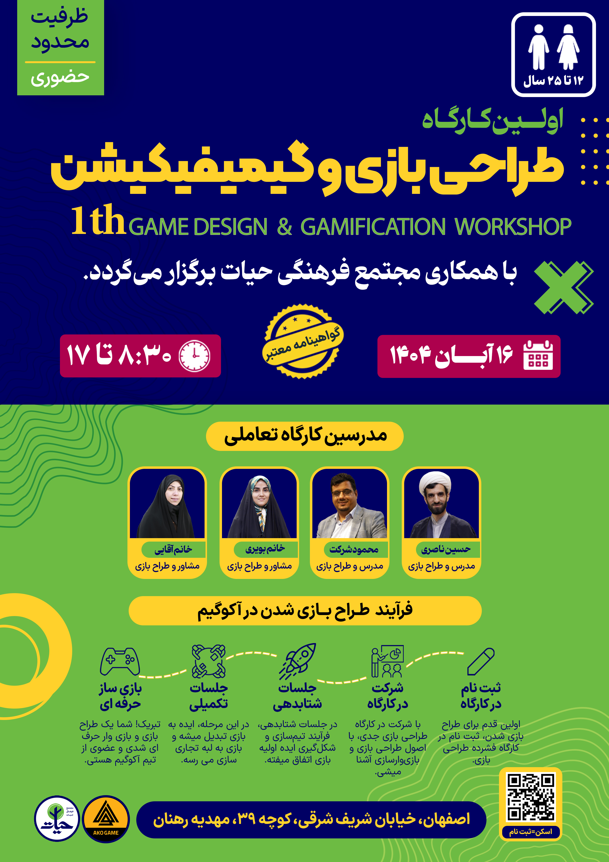 🟢 اولین کارگاه آموزشی طراحی بازی و گیمیفیکیشن روز جمعه 16 آبان ماه به همت مجتمع فرهنگی حیات در مهدیه رهنان برگزار میشه.